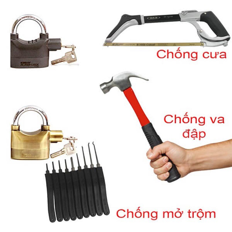 - Khả năng chống chịu va đập của khóa cũng cực kì ấn tượng. Với các dụng cụ phá khóa thông thường đều sẽ không có tác dụng trừ khi bạn đặt nó xuống đất và dùng búa tạ tác dụng với một lực cực mạnh mới có thể gây ra được tổn hại cho sản phẩm.