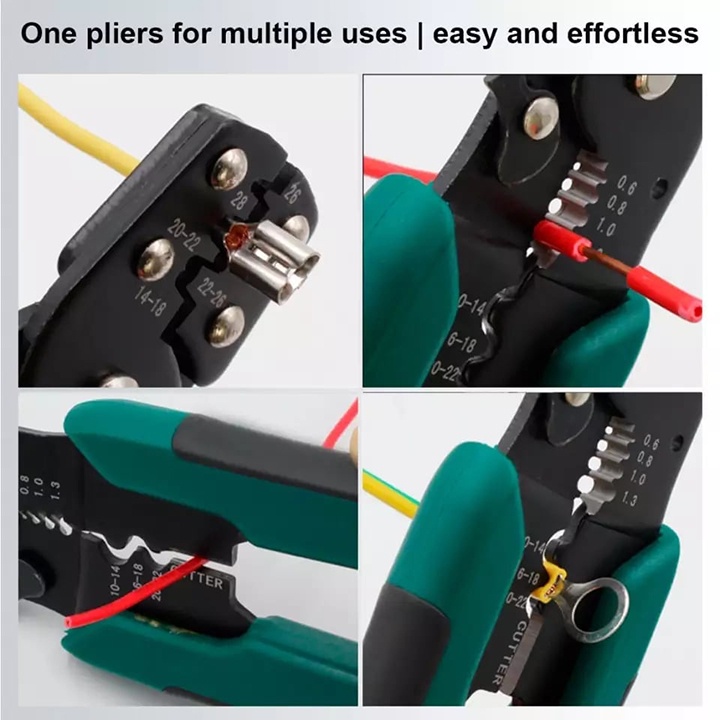 _ Tích hợp 3 chức năng tuốt dây, cắt dây, bấm cos_ Chất liệu: thép hợp kim CR-V phú lớp chống gỉ, tay cầm bọc nhựa êm tay chống trượt
