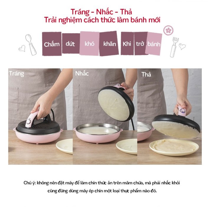 4/ Làm nóng máy 1 - 2 phút, tiến hành thao tác, tráng bột sau đó chờ khoảng 20s, thấy bánh tỏa ra hương thơm, đồng thời bánh bắt đầu tách rời, đó là dấu hiệu bánh chín