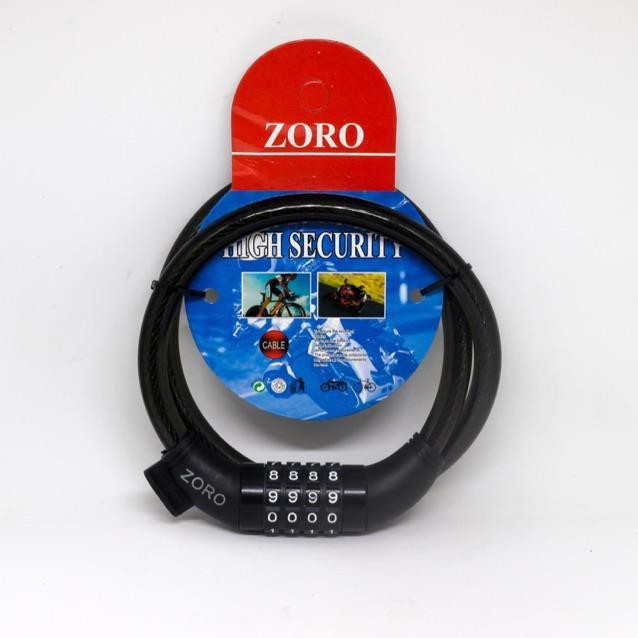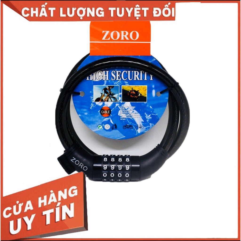 Mô tả: khoá dây số zoro có ruột bên trong bằng các sợi cáp nhỏ đan lại tạo thành một khối chắc chắn, bên ngoài được bọc lớp nhựa dẻo, tăng độ chịu lực của khoá, chống cắt, chống nước.