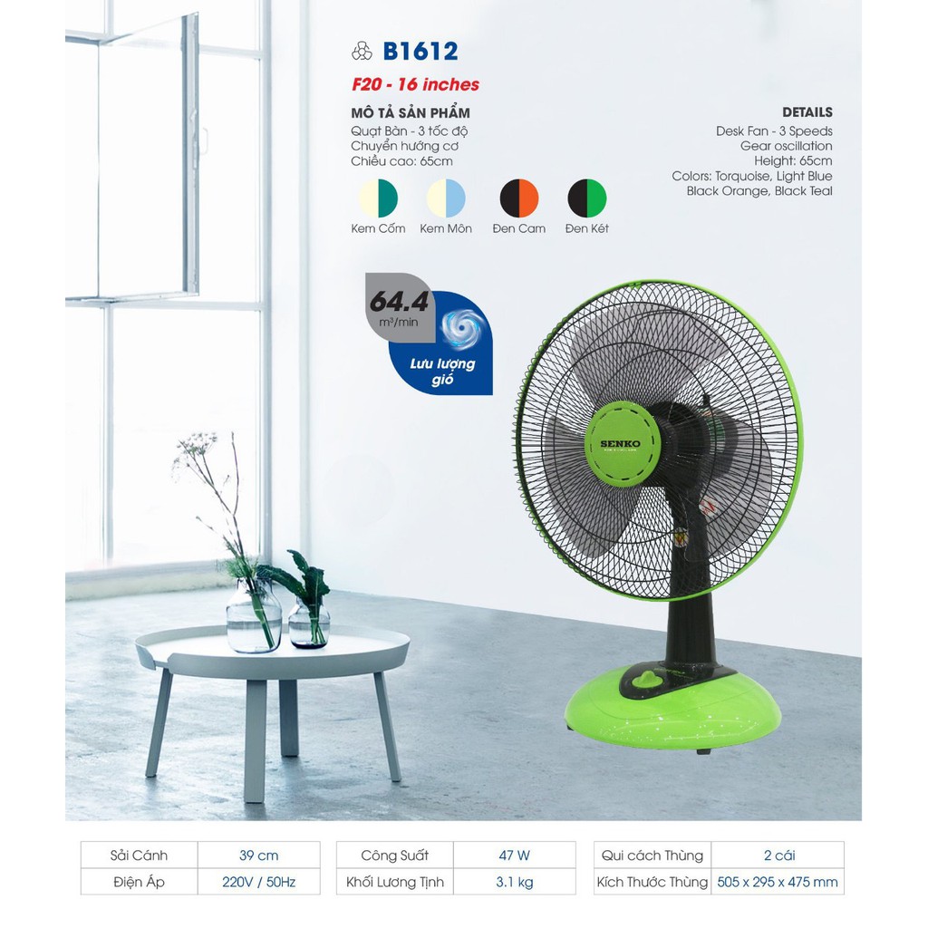 Giới thiệu FREESHIP Quạt bàn Senko B1612( hàng chính hãng, mới 100%)