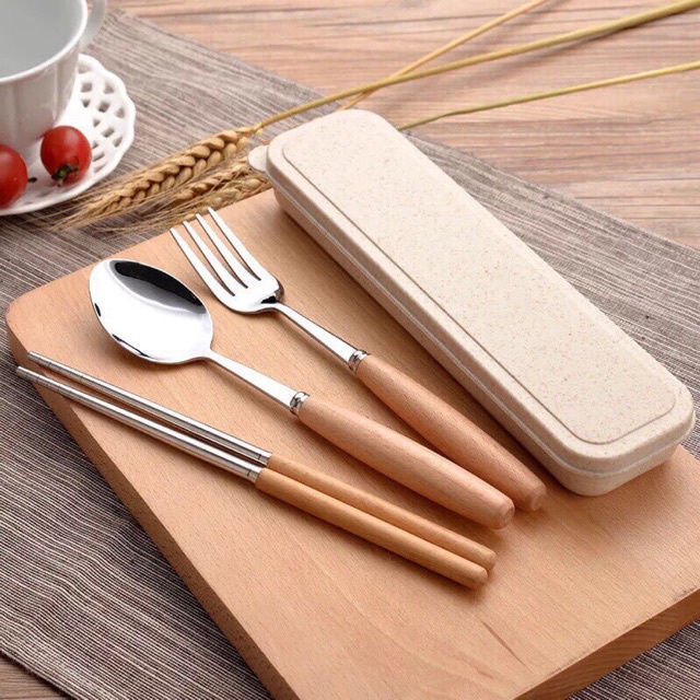 [FREESHIP❤️] SET 3 BỘ ĐŨA THÌA INOX CÁN GỖ ( Kèm hộp lúa mạch tiện dụng)