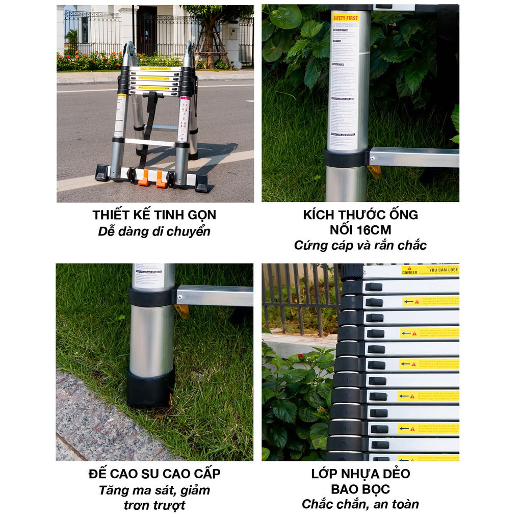 - Thang nhôm rút đơn DAMITA R26 có tải trọng lên đến 150Kg và trọng lượng thang nhẹ chỉ 7Kg nên phù hợp với mọi lứa tuổi sử dụng, với trọng lượng nhẹ, thiết kế nhỏ gọn nên bạn có thể di chuyển thang nhôm rút đơn đến mọi địa hình mà không hề gặp khó khăn .