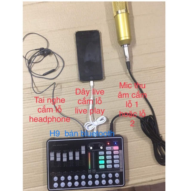 ***Combo Đơn giản 3 món đủ để hát hò live quá tuyệt vời1. Soundcard H9 ( hoặc k9 bản có bluetooth) có dây live dây lấy nhạc dây kết nối máy tính kèm dây live theo h9