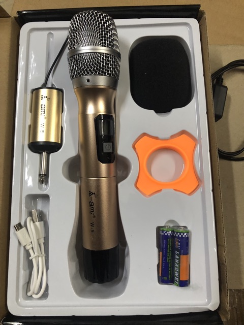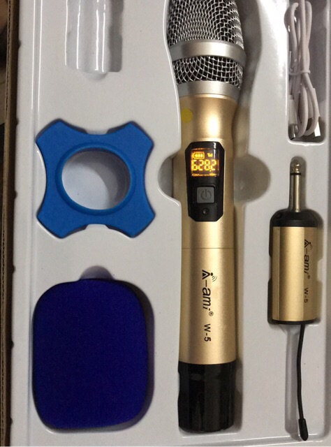 Micro bluetooth không dây cao cấp Ami w-5 được trang bị Đầu thu mini nhỏ gọn chỉ bằng 2 ngón tay, có jack 6.5mm chỉ cần cắm trực tiếp vào amply karaoke hoặc các loại loa kéo đều được. Micro xài pin 2A dể dàng mua trên thị trường.