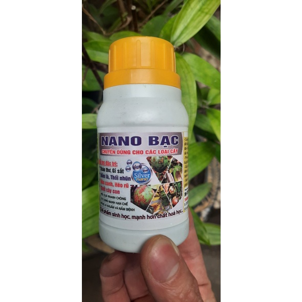 Nano Bạc được ứng dụng rộng rãi trong mọi lĩnh vực của đời sống: trồng trọt, chăn nuôi, khử mùi, khử trùng , xử lý nước bể bơi, ngâm rửa rau củ quả, y tế….Nano Bạc là bạc ở dạng nguyên tố ở kích thước nano, nên tính kháng khuẩn của nguyên tố bạc được phát huy mạnh mẽ hơn. Nano Bạc có khả năng diệt trên 650 loại vi khuẩn, vi rút, nấm mốc mà không tạo tính kháng thuốc. Hiện tại, Nano Ag đang được khuyến khích sử dụng trong chương trình nông nghiệp hữu cơ, nông nghiệp sạch để phòng trừ các bệnh do vi khuẩn, vi rút, nấm mốc, rong rêu trên cây. Công dụng: - Dung dịch xịt hun hoa lan và cây cảnh Nano –Ag có khả năng diệt vi khuẩn, vi rút, nấm mốc và hạn chế các bệnh liên quan tới thối, rụng lá, thân thiện với môi trường và sức khỏe con người. Thành phần: Nano- Ag và các dưỡng chất.Hướng dẫn sử dụng:Chai 100ml: - Giai đoạn phòng bệnh: dùng 20ml pha với 3 lít nước. Tuần sử dụng 1-2 lần. - Giai đoạn trị bệnh: dùng 30 ml dung dịch pha với 1 lít nước. Tuần sử dụng 2-3 lần.