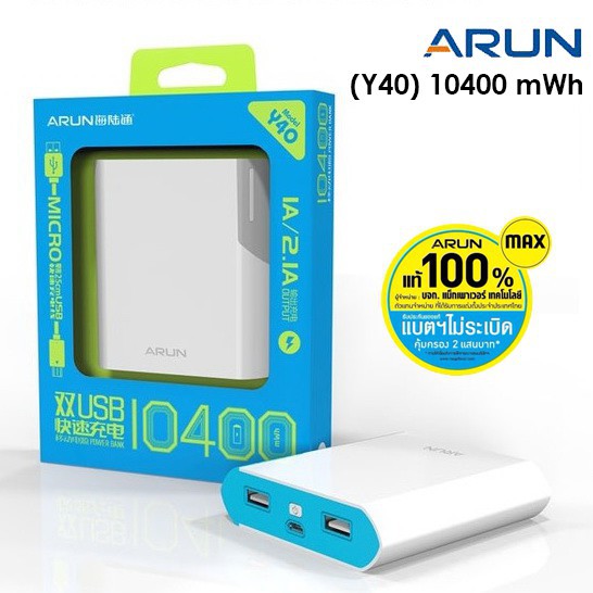 - Đặc biệt, PIN SẠC DỰ PHÒNG ARUN Y40 10.400 MAH , còn được trang bị hệ thống 04 đèn LED thông báo 4 mức độ tình trạng pin. PIN SẠC DỰ PHÒNG ARUN Y40 10.400 MAH là người bạn đồng hành không thế thiếu của bạn trong mọi hành trình.