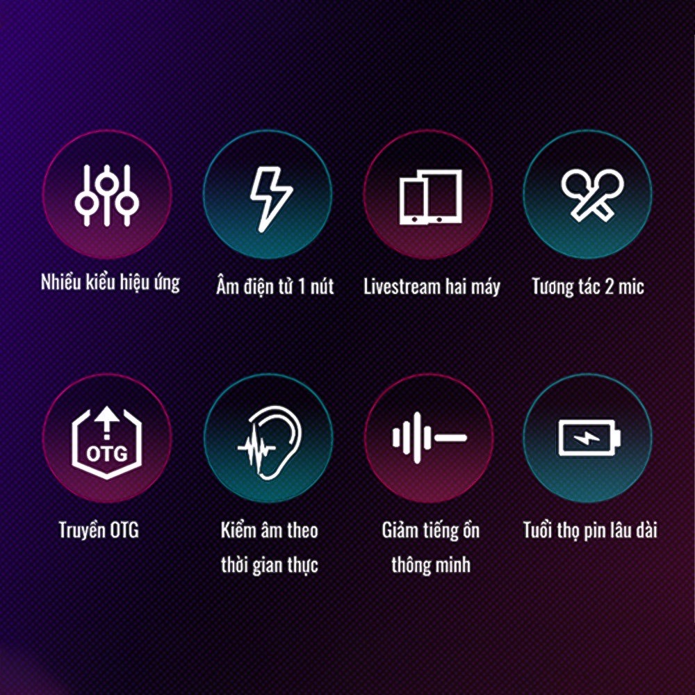 • Tích hợp chip DSP, một phím chuyển đổi 8 hiệu ứng âm thanh đẹp, thao tác thuận tiện và nhanh chóng;