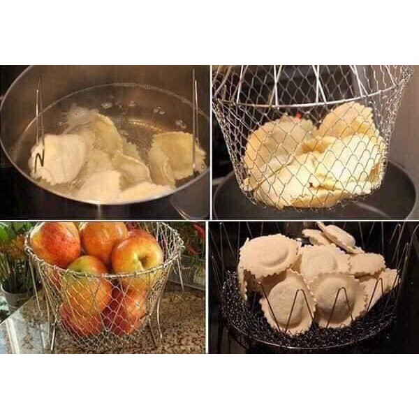 👉🏻được làm bằng chất liệu thép không gỉ, đa chức năng như dùng để chiên, hấp, tái, chần, rửa rau, phơi thực phẩm, đựng thức ăn sau khi chiên, luộc