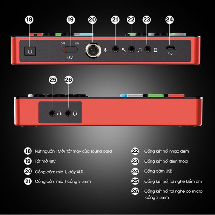 - Tương thích với nhiều micro, tích hợp nguồn 48w, phù hợp với cả mic dynamic hoặc condenser, mic ở tai nghe