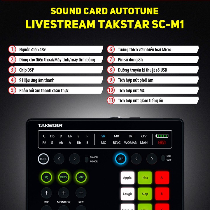 🎤★☆★☆★ 1. GIỚI THIỆU SẢN PHẨMSC- M1 là một loại sound card âm thanh di động được thiết kế cho hát karaoke và livestream. No tương thích với điên thoại thông minh, máy tính bẳng và máy tính. Hệ thống ISO, Android, Windown. tích hợp chip kĩ thuật số DSP, hoạt động chỉ bằng một nút bấm, với nhiều hiệu ứng âm thanh đặc sắc, giúp việc phát sóng trực tiếp trở nên đơn giản , dễ hiểu.
