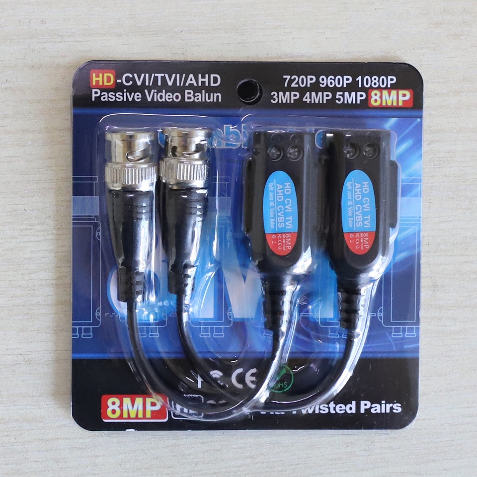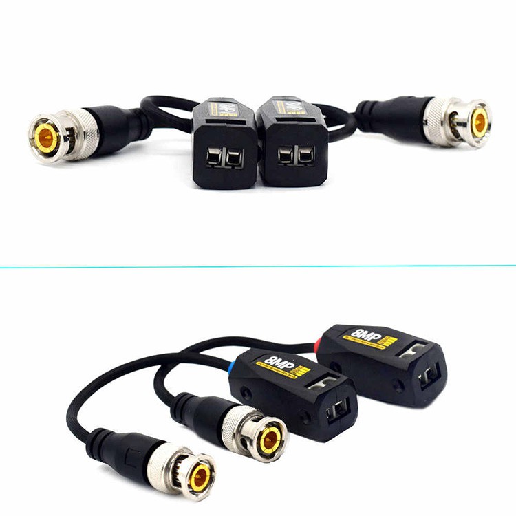 - Video balun 5MP có bảo vệ điện áp. Chất liệu: Nhựa ABS. Một bộ bao gồm 2 cái, lõi kẹp bằng đồng , kim đồng tiếp xúc cực tốt.