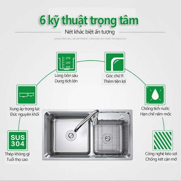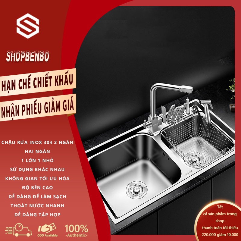 Chậu rửa chén bát bồn rửa chén bát 2 ngăn inox 304 không gỉHai ngăn 1 lớn 1 nhỏ, thoải mái tùy ý sử dụng cho số lượng bát đĩa, thực phẩm, ... và các mục đích khác nhau