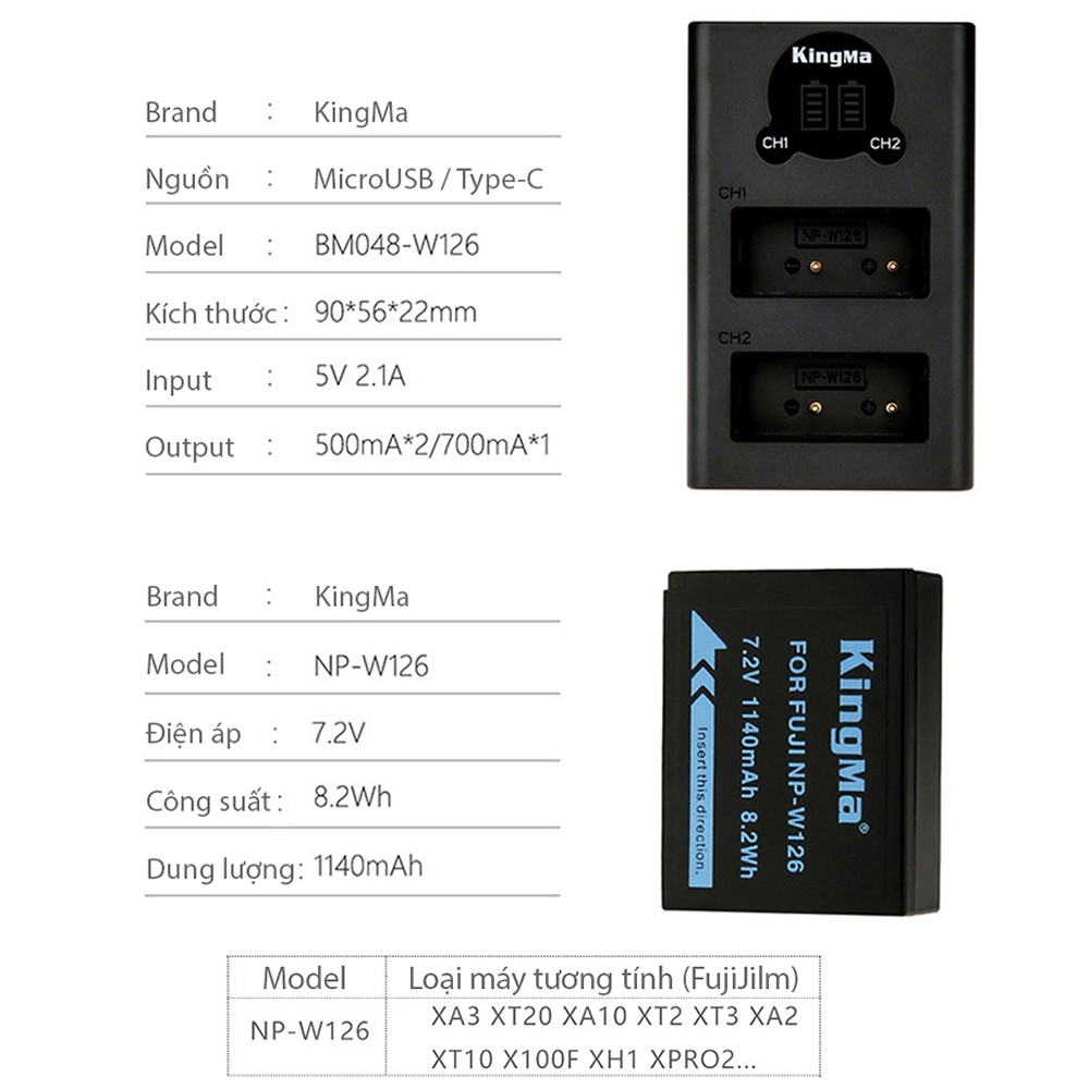 Giới thiệu [FujiFilm] Combo 2 pin 1 sạc đôi thông minh Type-C KingMa NP-W126 / NP-W126S cho máy FujiFilm (tặng hộp đựng pin)