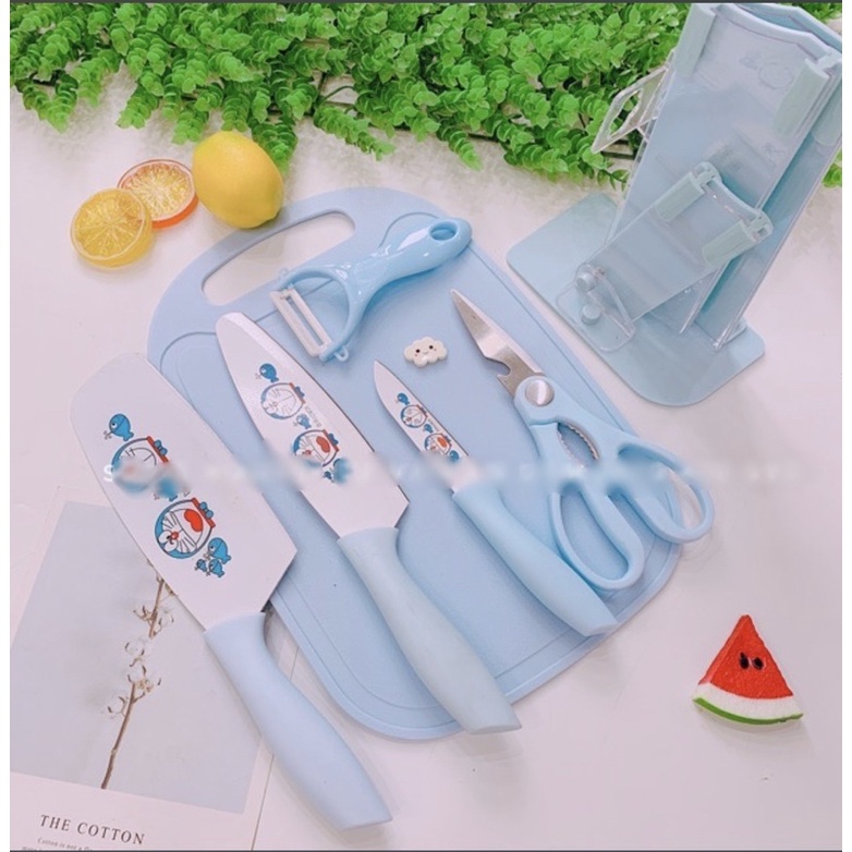 ✅ Bộ dao kéo 7 món gồm: 1 dao chặt + 1 dao thái + 1 dao cắt trái cây + 1 kéo đa năng + 1 gọt vỏ + 1 thớt nhựa + 1 khay đế. Tất cả được đặt trong 1 khay đế chắc chắn, thiết kế cũng đẹp nữa. Giúp để dao gọn gàng, tránh nguy hiểm. Bộ sản phẩm còn đi kèm với 1 thớt nhựa để thái thịt, rau củ, trái cây.