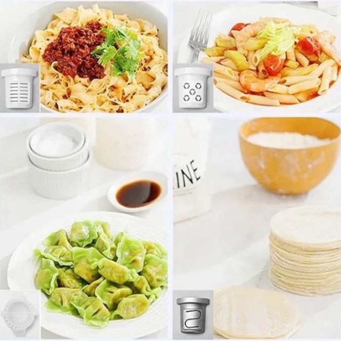 + Phụ kiện đi kèm: 13 Khuôn làm mì, bún ...,1 cốc đo bột, 1 cốc đo nước, 1 đầu gạt, 1 khay làm sủi cao (Shui jiao)