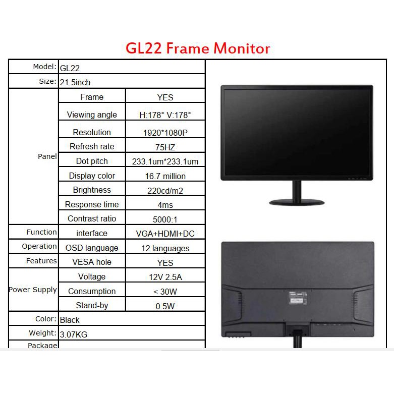 Màn hình LCD GL 22 inch new.... Bảo hành 12 tháng!THÔNG SỐ KĨ THUẬT :