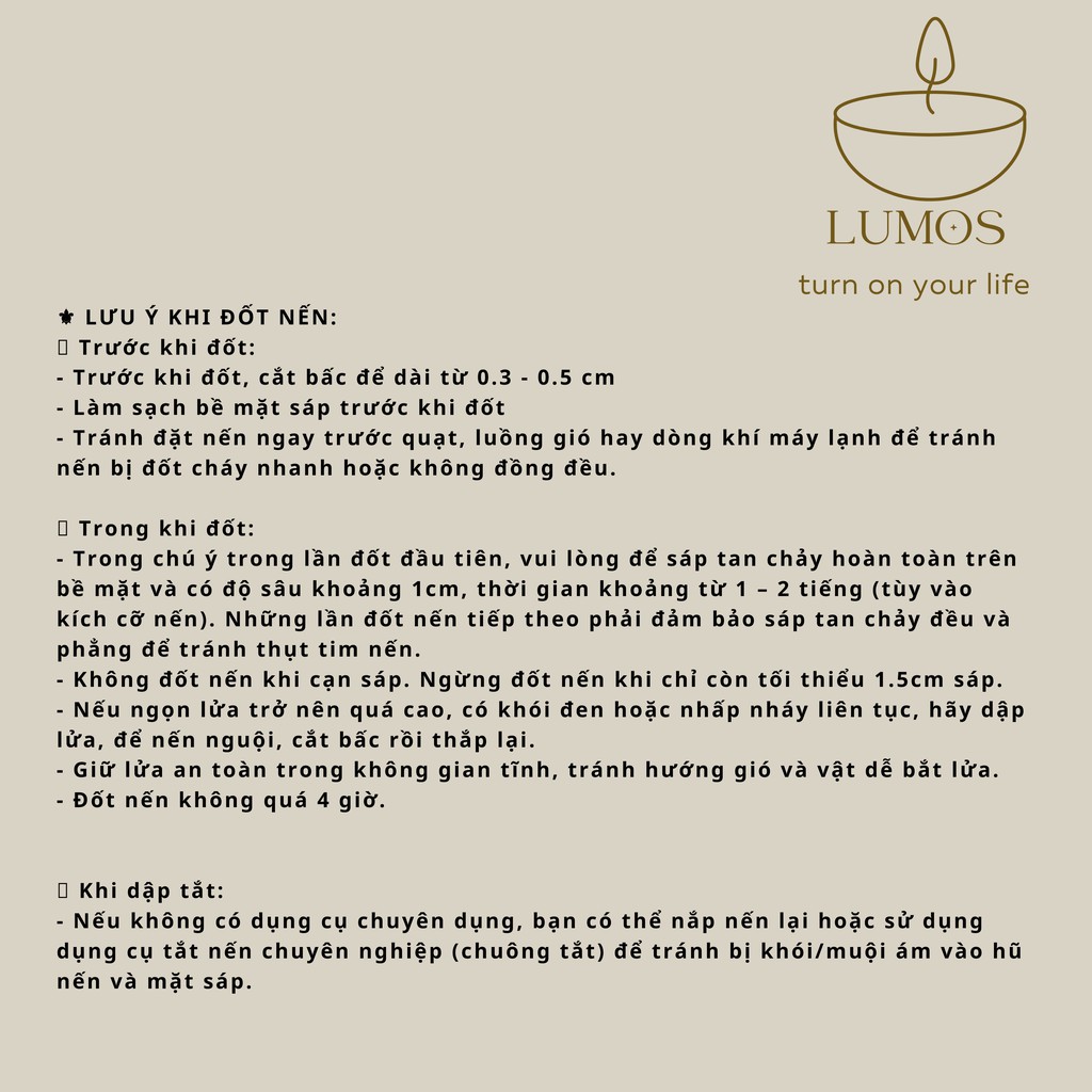 Nến Thơm Lumos là thương hiệu nến thơm của Việt Nam được làm từ những nguyên liệu tự nhiên Đạt tiêu chuẩn SGS quốc tế, xuất khẩu sang USA, EU an toàn đối với sức khỏe con người.Nến Thơm Lumos hiện được rất nhiếu khách hàng yêu quý và đánh giá cao về chất lượng sản phẩm cũng như mẫu mã. Đặc biệt có cả các nghệ sĩ của Việt Nam.