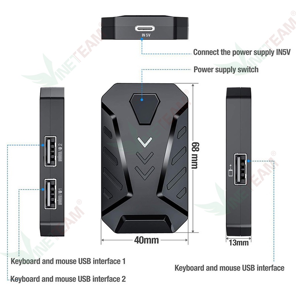 Bộ chuyển đổi G-Mix Pro được thiết kế vô cùng nhỏ gọn. Trên bộ chuyển đổi được thiết kế 2 cổng usb dùng để kết nối chuột và bàn phím, 1 cổng sạc Type-C và một cổng usb dùng để sạc điện thoại khi chơi game.