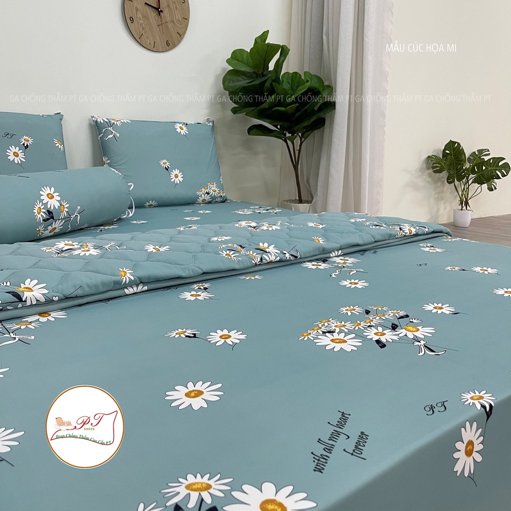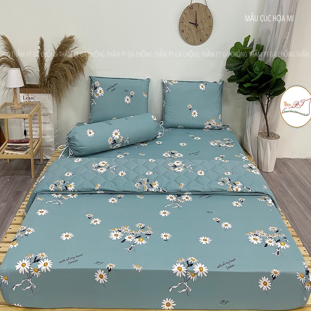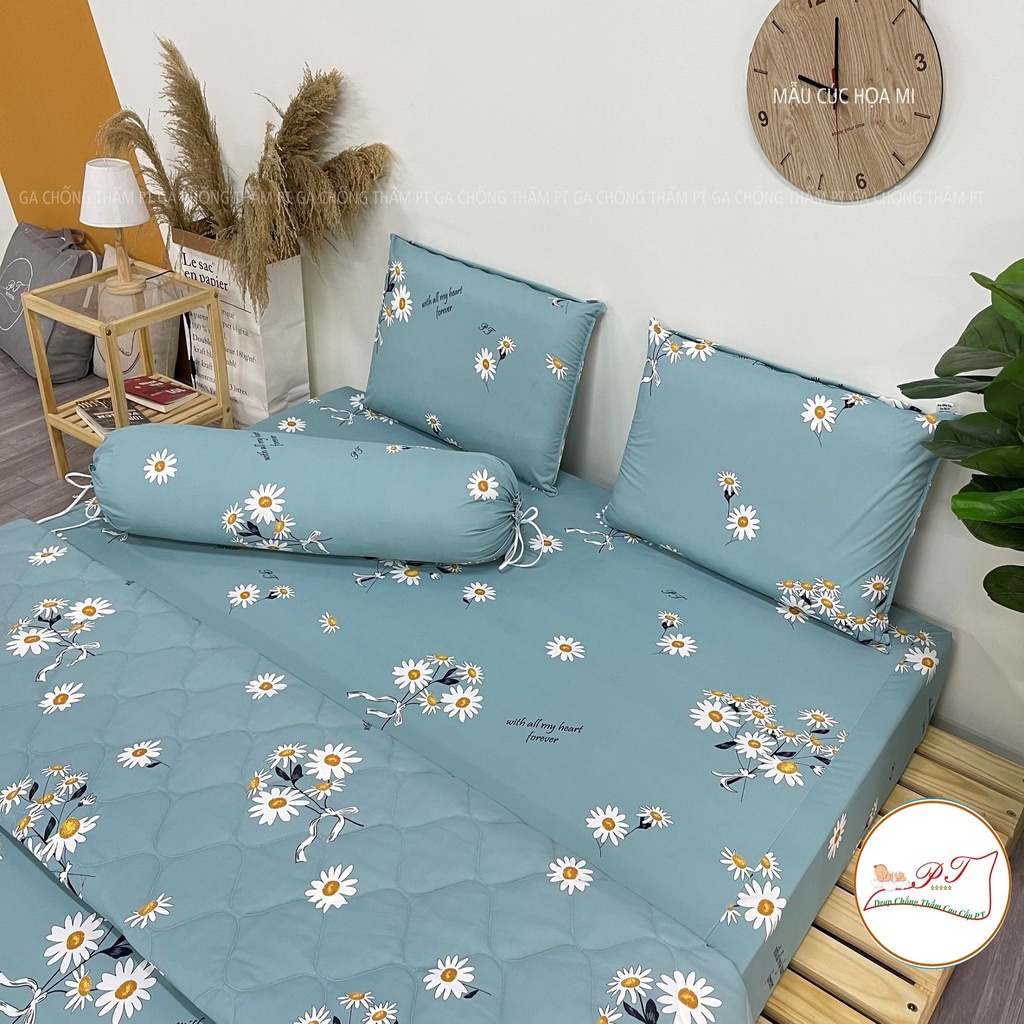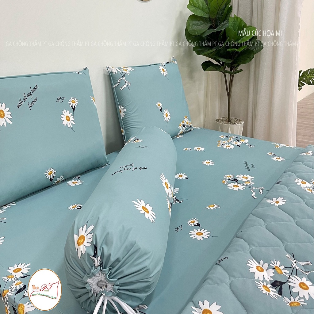 Bộ ga chống thấm cotton cho bé, drap chống thấm nước cao cấp kèm vỏ gối đầu và vỏ gối ôm mềm mịn mát (mẫu cúc họa mi)