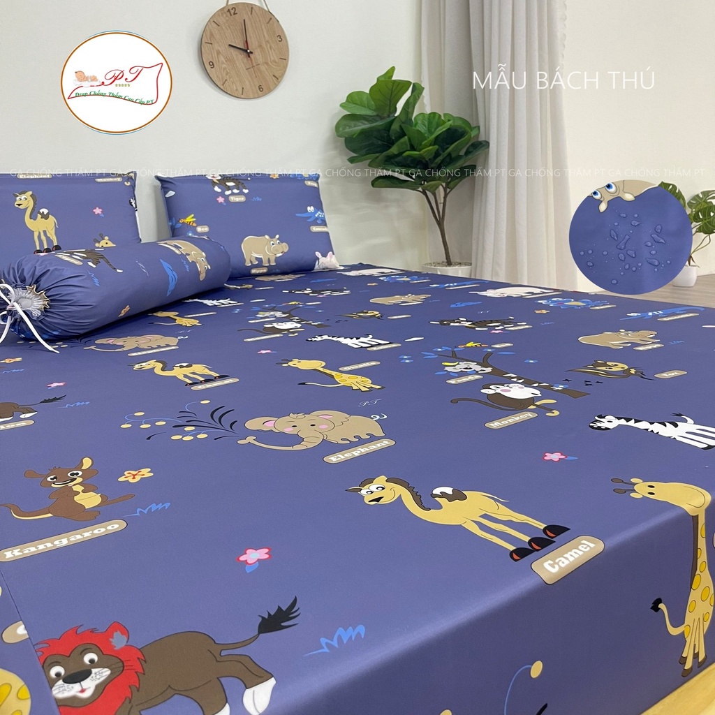 Bộ ga chống thấm cotton cho bé, drap chống thấm nước cao cấp kèm vỏ gối đầu và vỏ gối ôm mềm mịn mát (mẫu bách thú)