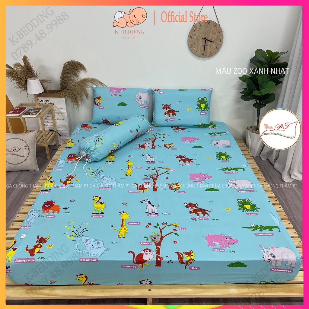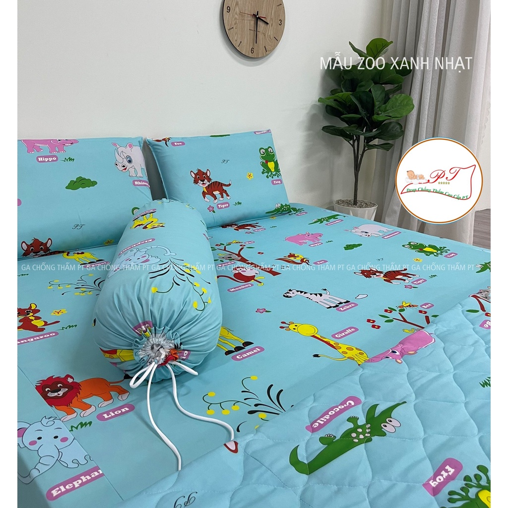 Bộ ga chống thấm cotton cho bé, drap chống thấm nước cao cấp kèm vỏ gối đầu và vỏ gối ôm mềm mịn mát (mẫu zoo nhạt)