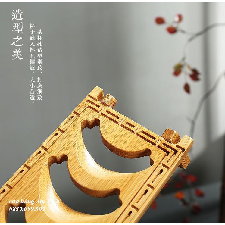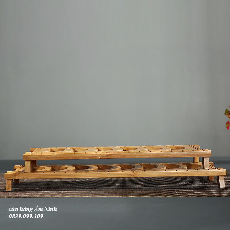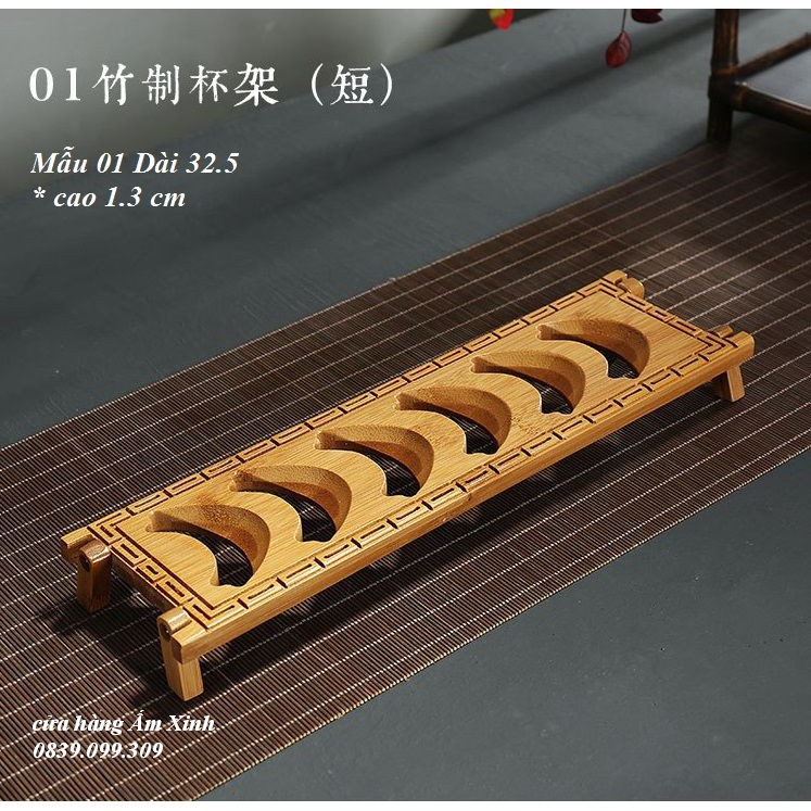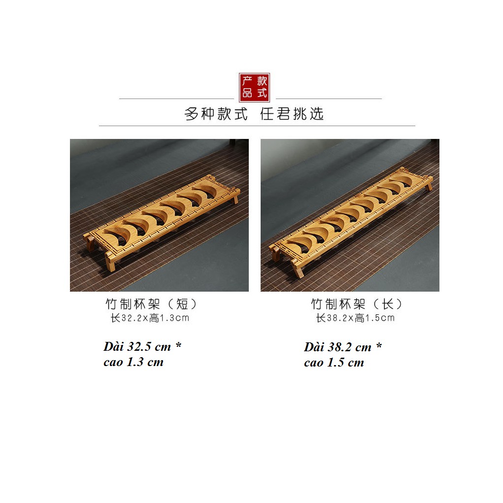 Gác chén bàn trà Đạo bằng tre tự nhiên 100%.+ Mẫu 01 (ngắn hơn) có kích thước: Dài 32.5 * cao 1.3 cm (có 06 vị trí để chén)