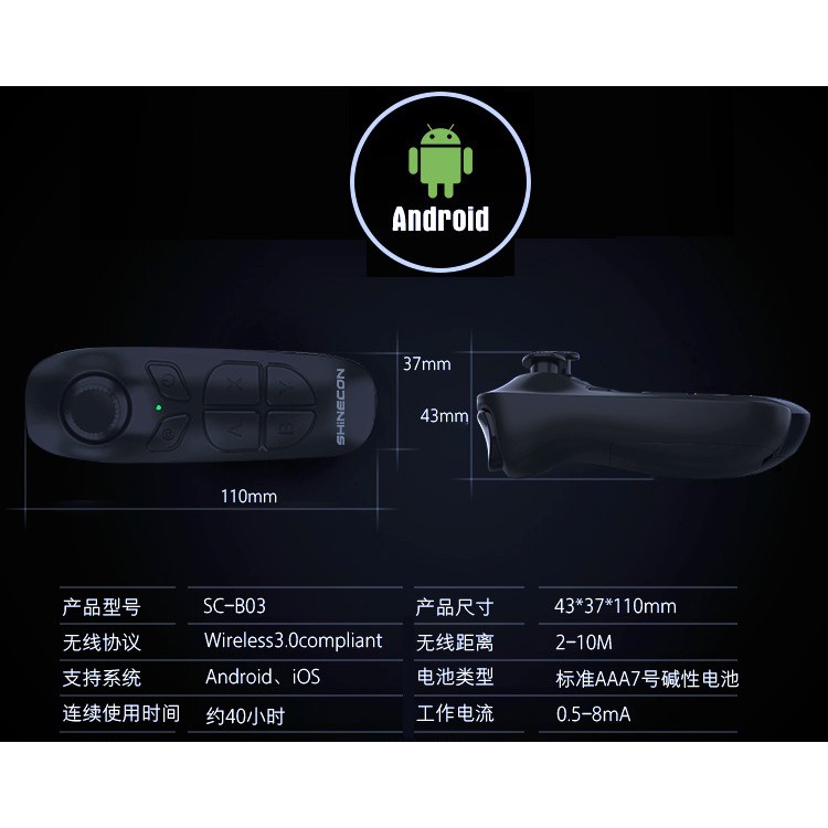 - VR Shinecon SC-B03 là bộ điều khiển không dây di động. Được sử dụng cho điện thoại di động, MID TV box, TV thông minh, PC, và như vậy, nó có thể được sử dụng như gamepad, VR từ xa, chuột không dây, điều khiển âm nhạc, E-book trang, Bluetooth Selfie