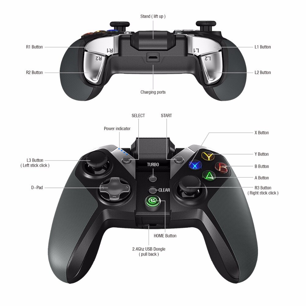 Thiết kế, bố trí với các nút phím đã được nhân bản hóa để hoạt động một cách gọn gàng, nhấn chính xác. Với hai góc điều chỉnh (115 độ và 150 độ, nhiều góc) giúp bạn có thể sử dụng theo ý muốn của mình cho các thiết bị điện thoại di động có kích thước từ 3.5 - 6 inches. Xây dựng trên khả năng kết nối không dây USB 2.4 Ghz giúp sản phẩm chơi tốt trên nền tảng Windows PC, Steam, PS3, Android và Android TV Box, iOs đặc biệt là với các trò chơi PuBg Mobile, Free Fire, Ruler Of Survival.