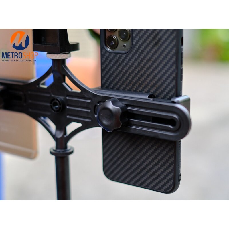 Bộ gắn điện thoại đèn LED và Mic Livestream. Với bộ chia này cho phép bạn gắn cùng lúc hai chiếc điện thoại, thậm chí là ba chiếc nếu cần. Ngoài gắn điện thoại để quay video, Livestream thì với bộ chia này chúng ta có thể gắn thêm đèn LED và MIC hỗ trợ thu âm.