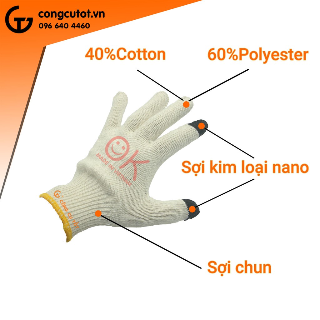 Găng tay tay bảo hộ cảm ứng xuất Nhật loại dày có thành phần chính 40% Cotton – 60% Polyester giúp sản phẩm có độ bền cao, thấm hút tốt, hạn chế tối đa việc bám bụi bẩn, chống nấm mốc.