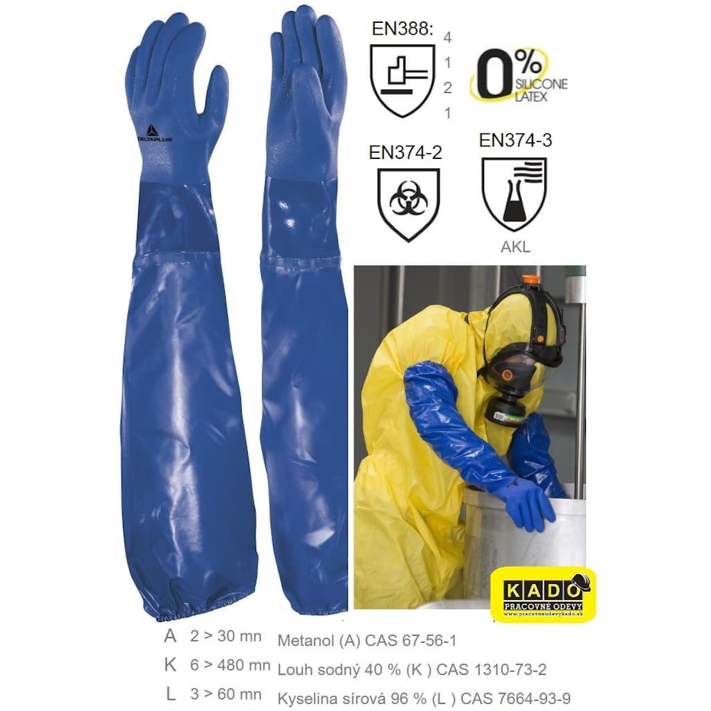 + EN ISO 374-5:2016 (găng tay chống hóa chất và các sinh vật có hại nguy hiểm); (mức kháng thấm hóa chất JKL, J:n-Heptane, K: Caustic soda 40%, L: Sulphuric acid 96%)
