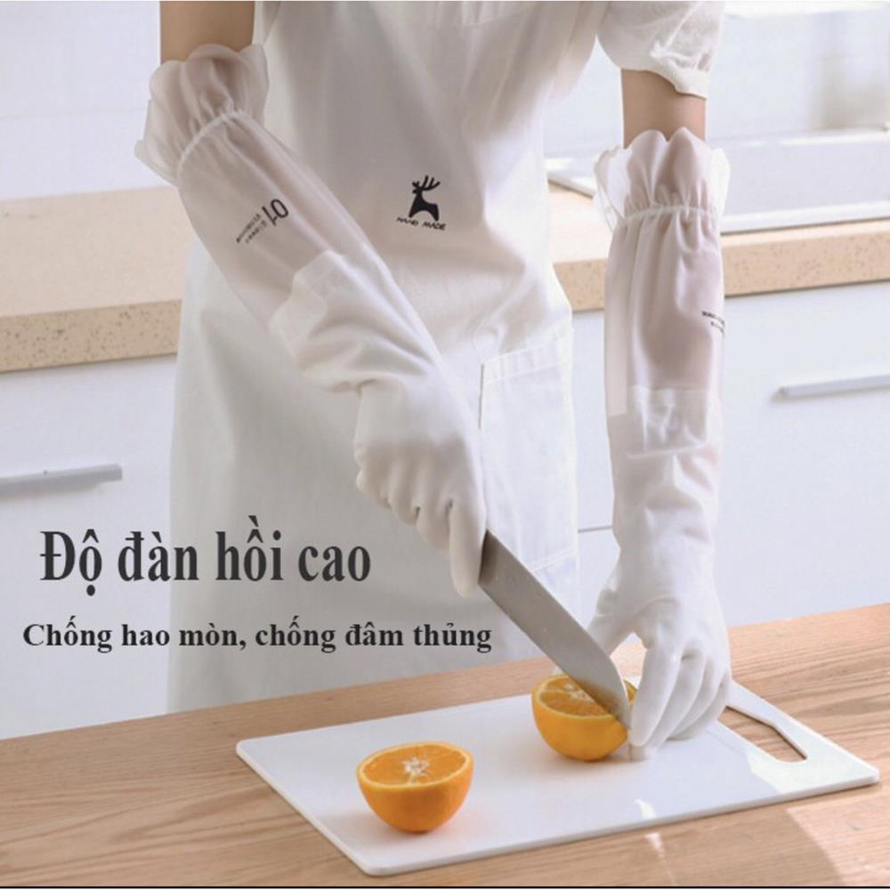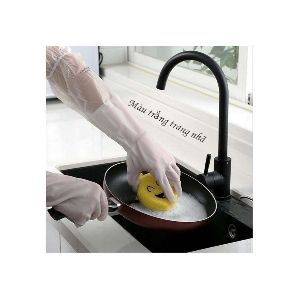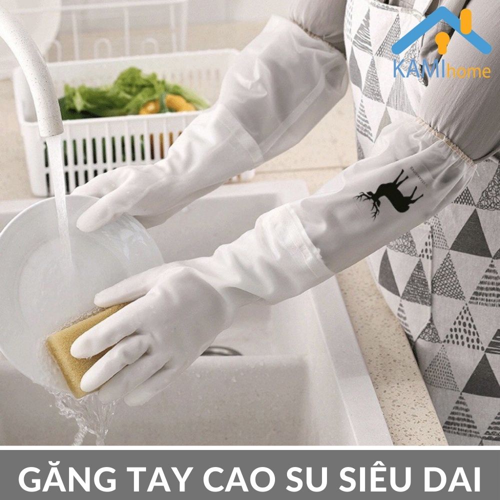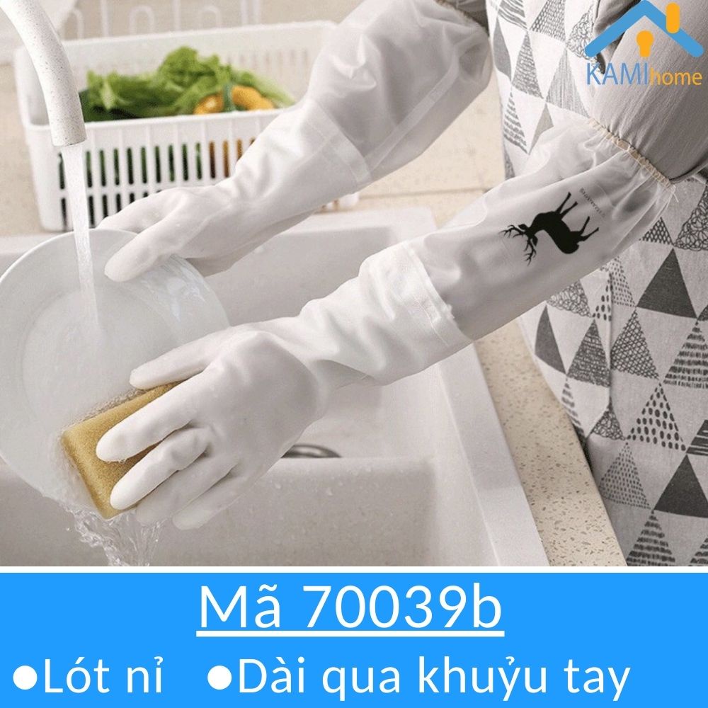 Găng tay cao su lót nỉ chống lạnh tay ống dài có đai thít kín rửa bát vệ sinh nhà cửa mã 70039