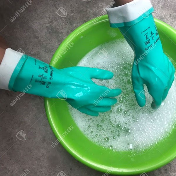 + Bao tay cao su chịu được xà bông, thuốc tẩy, hóa chất tẩy rửa nặng. Không bị bở dão, không phồng rộp, không nở.