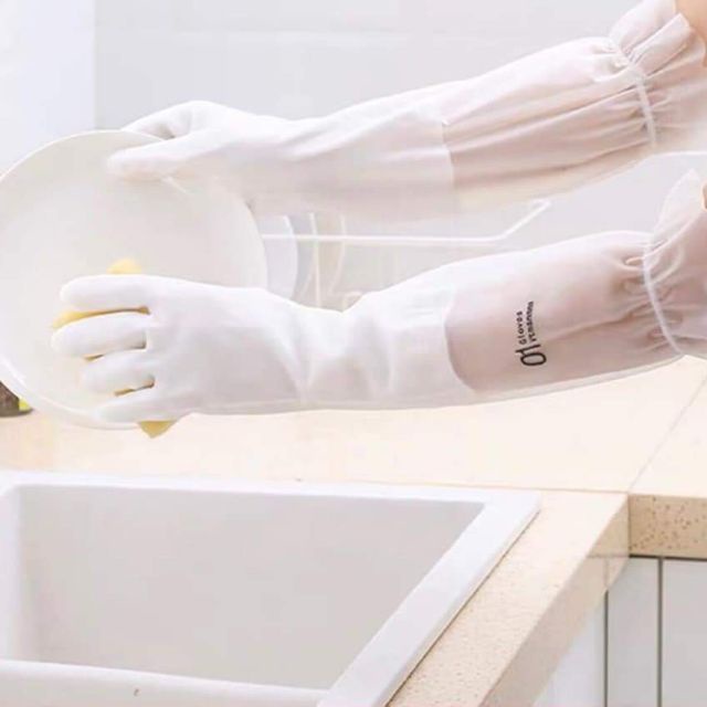 Găng Tay Cao Su Trắng Lót Nỉ Siêu daiBao tay dài 48cm có lớp lót và vòng chun nhằm giữ không bị tuột hay nước vô tay