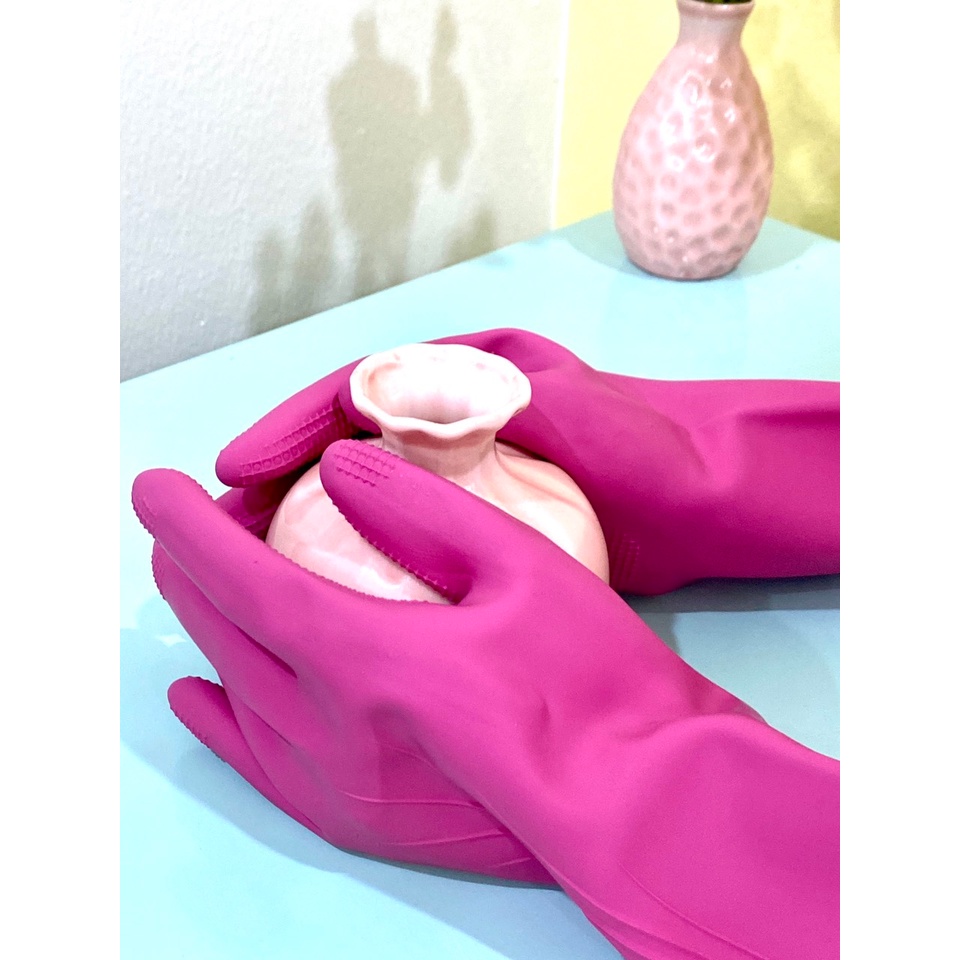Mặt trên găng tay có thiết kế trơn đẹp mắt cùng mặt tiếp xúc phía dưới có thiết kế gai nhỏ, dày giúp tăng ma sát, giúp bạn không bị trượt tay khi bê, cầm các đồ vật. Chiều dài đến 37cm dài qua khuỷu tay nên rất tiện khi sử dụng. Mùa đông hanh khô, trời lại lạnh nữa, chị em nhớ dùng găng tay cao su khi vệ sinh nhà tắm, rửa bát. Bảo vệ da tay khi tiếp xúc với các chất tẩy rửa, hóa chất gia dụng, nước dơ, các chất bụi bẩn...