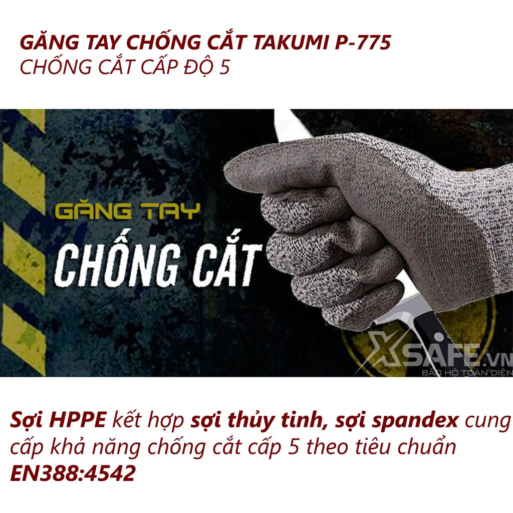 Giới thiệu Găng tay chống cắt Takumi P-775 cấp độ 5 độ khéo léo cao - lòng bàn tay phủ PU chống dầu, tăng độ bám Găng tay bảo hộ