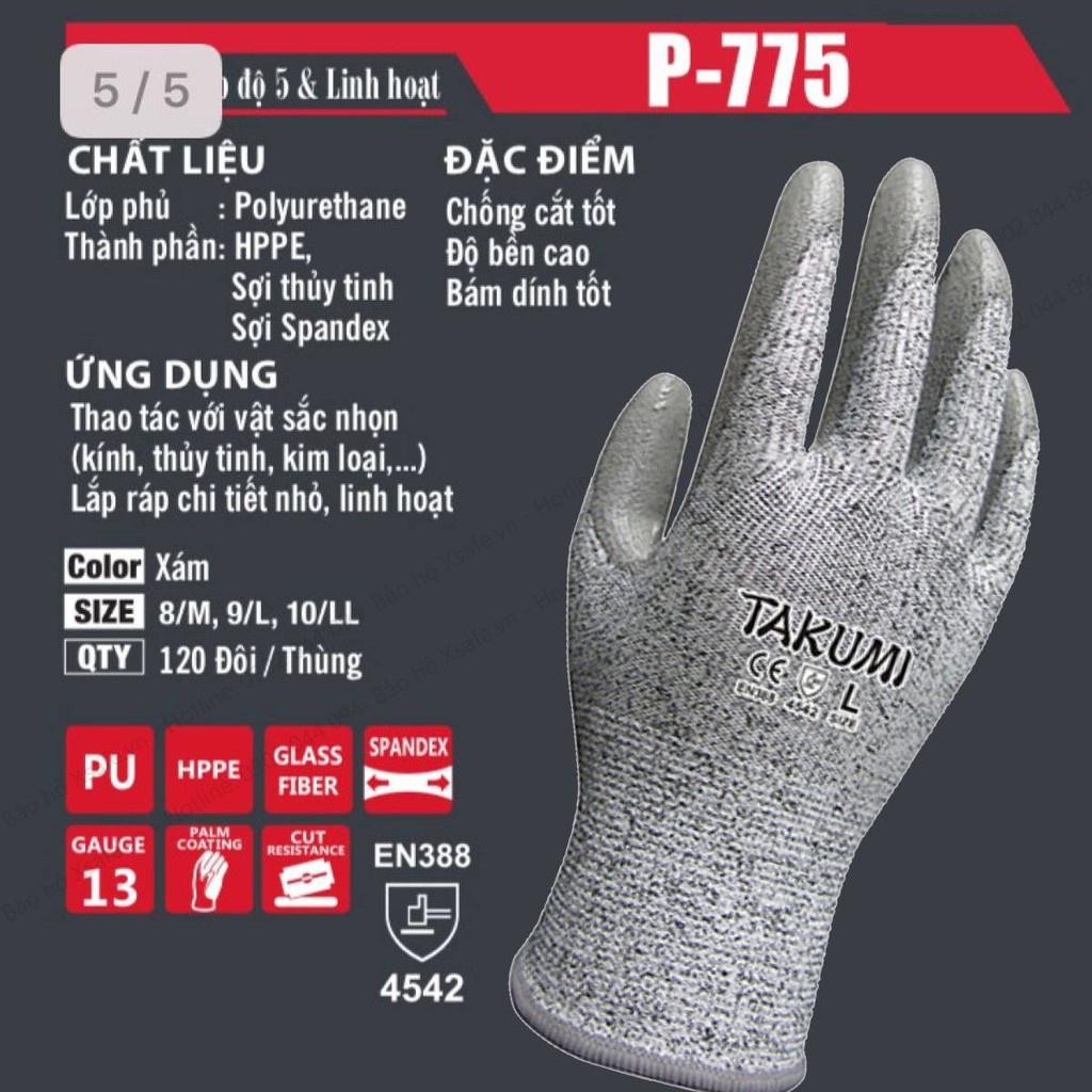 ☑️ Găng tay Takumi P-775 là mẫu găng tay chống cắt cấp độ 5 của thương hiệu Takumi Nhật Bản. Găng vừa độ co dãn giúp quá trình làm việc thoải mái và dễ dàng hơn vừa có khả năng chống cắt, chống rách, chống hao mòn rất tốt