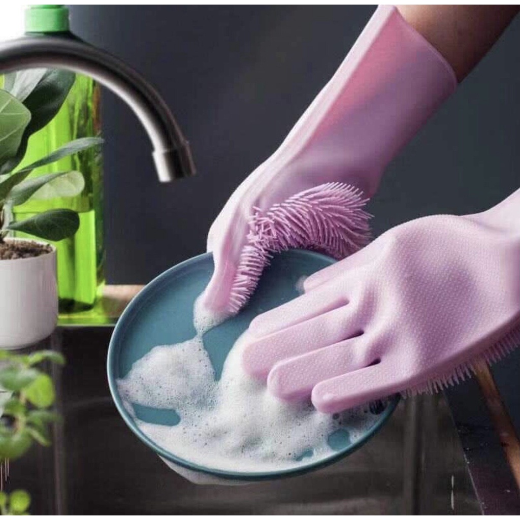 - Găng tay rửa bát không cần dùng đến giẻ, lớp gai silicon sẽ vừa làm sạch lại tạo bọt cực nhiều.