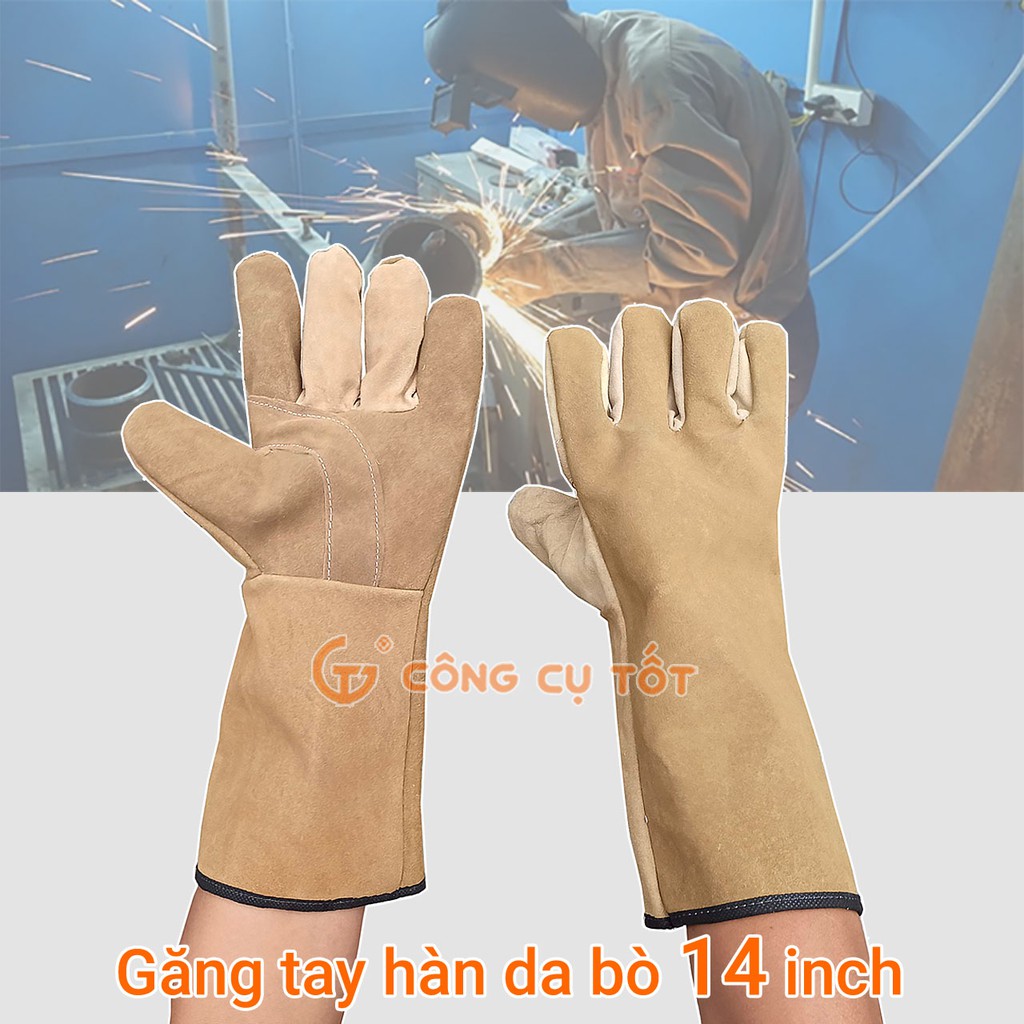 Găng tay thợ hàn 14 inch được may từ da bò đã qua xử lý chống nấm mốc và vi khuẩn. Sản phẩm là phụ kiện bảo hộ lao động giúp bảo vệ đôi tay của người thợ khổi các tác nhân như: tia lửa, mạt kim loại, nhiệt lượng, ....Chống tia lửa, mạt kim loại, vật sắc nhọn