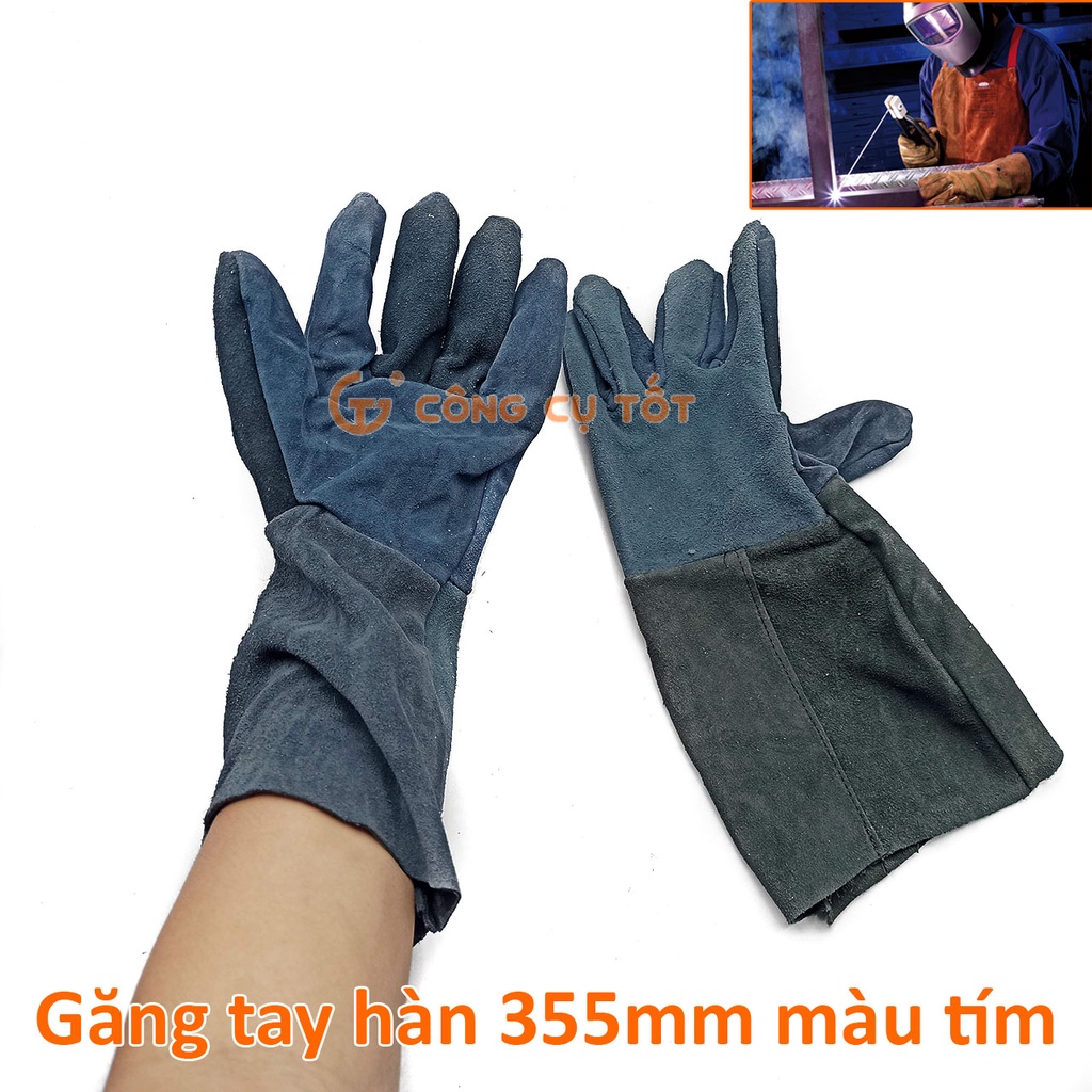 Găng tay hàn hồ quang loại dài 14 inch 355mm làm từ da bò dày dặn, có độ bền cao, chất da chắc, khó xé, khó rách và không bị rão, bảo vệ người sử dụng khỏi các vật sắc nhọn, tia lửa hàn, mạt sắt, ...Găng tay hàn loại dài 14 inch 355mm màu tím chuyên sử dụng loại găng tay này để hàn MIG, hàn hồ quang.