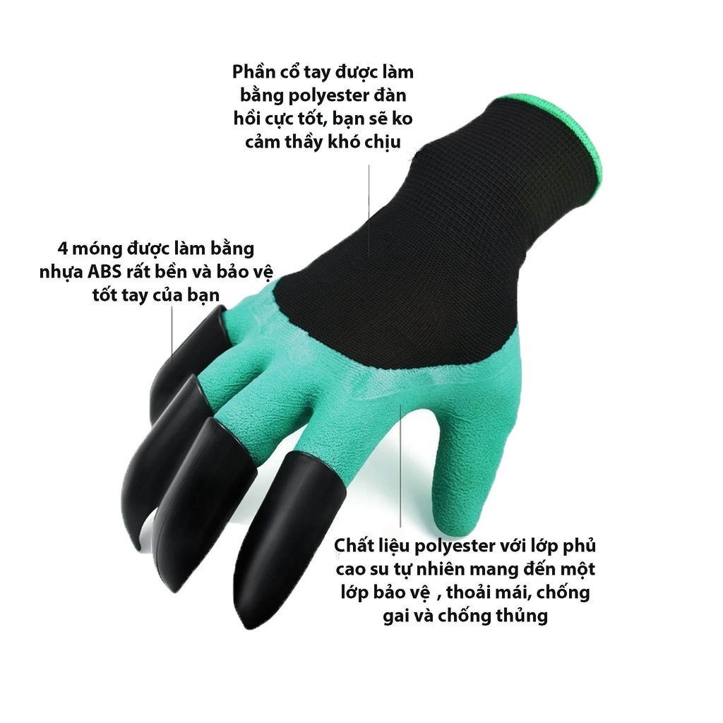 Găng Tay Làm Vườn Có Móng Chuyên Dụng Độc Đáo. Móng vuốt bằng nhựa ABS cứng có thể thay thế cho xẻng, dao... trong những trường hợp nhẹ nhàng. Vô cùng tiện dụng.✔️ Chất liệu găng tay cao su latex, chống mòn và thoáng khí.