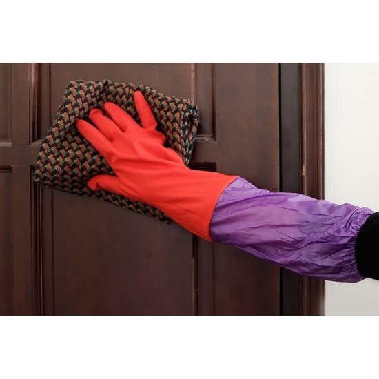 – Phần kéo dài màu tím bằng polyester được bo chun chắc chắn giúp cố định găng tay khi làm việc đồng thời ngăn không cho nước bắn lên tay áo.