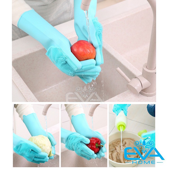 - Bộ sản phẩm gồm : 1 đôi Găng tay silicon kiêm miếng rửa bát