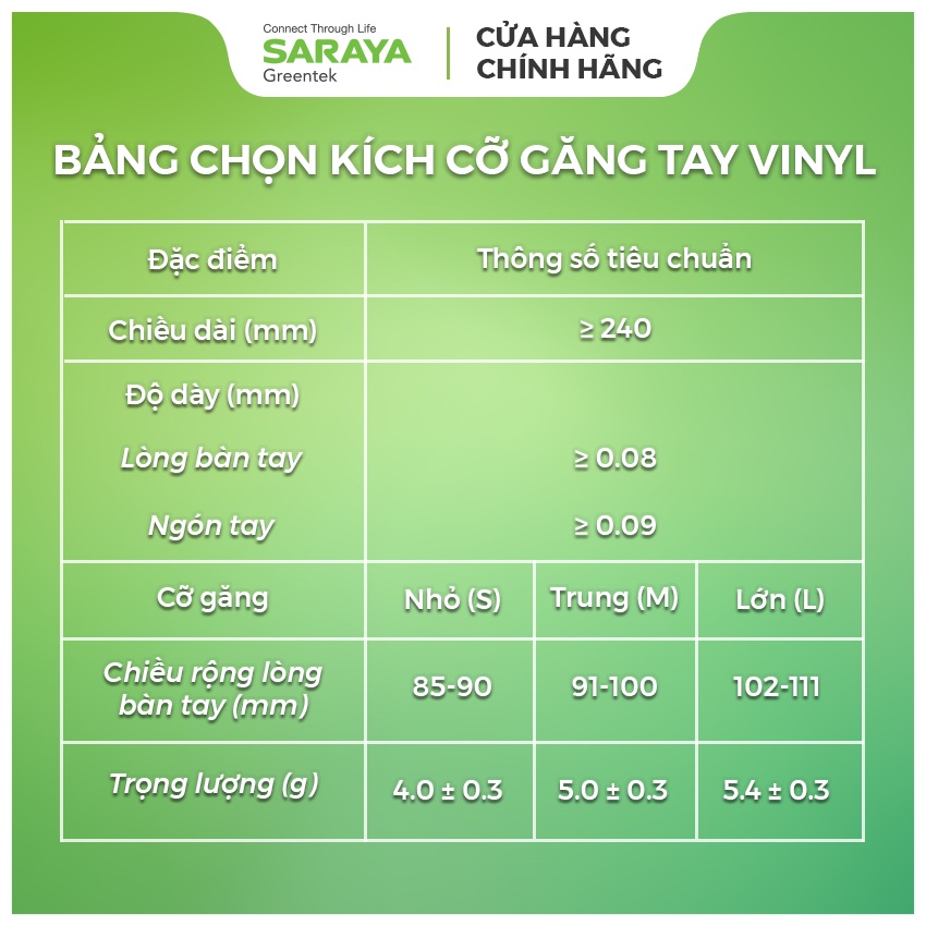 Thông số kỹ thuật : Độ dày đầu ngón tay: 0.09mm, lòng bàn tay: 0.08mm, chiều dài trung bình: 240mm.