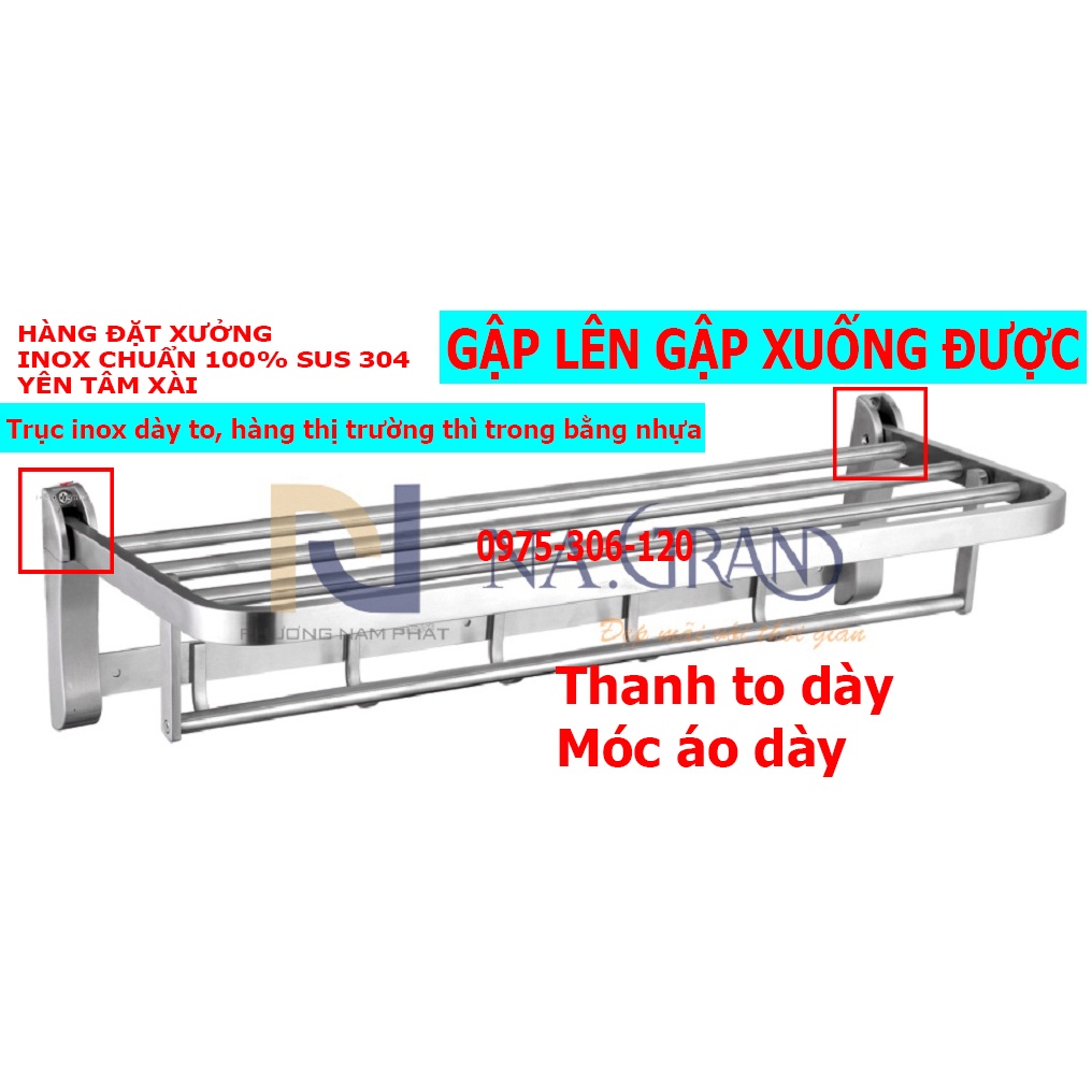 Thanh treo khăn gập lên gập xuống được, trục bằng inox chắc chắn, vít tường chắc chắn, hàng đặt xưởng, dày, nặng tay, inox chuẩn chống han rỉ, hàng rất hài lòng, có chỗ để khăn, treo khăn, móc khăn