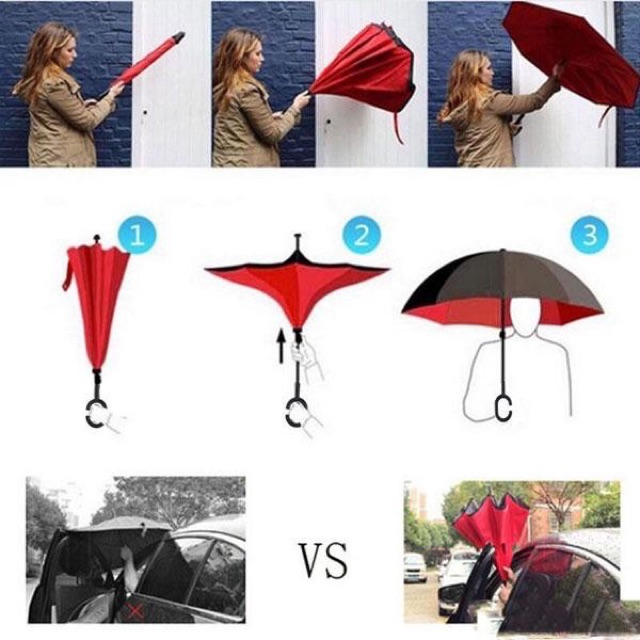 Chiếc ô dù mở ngược này được thiết kế mở ngược so với chiếc dù truyền thống – Đỉnh dù nằm bên trong. Khi mở dù, ta cũng kéo thanh bấm lên trên. Nhưng thay vì mở sang hai bên, cánh dù sẽ đổi hướng khi kéo thanh bấm lên trên cùng. Sau khi mở hẳn, chiếc ô gấp ngược thông minh với hình dáng không khác với các loại dù thông thường, nhưng có rất nhiều lợi ích kèm theo thiết kế mới.