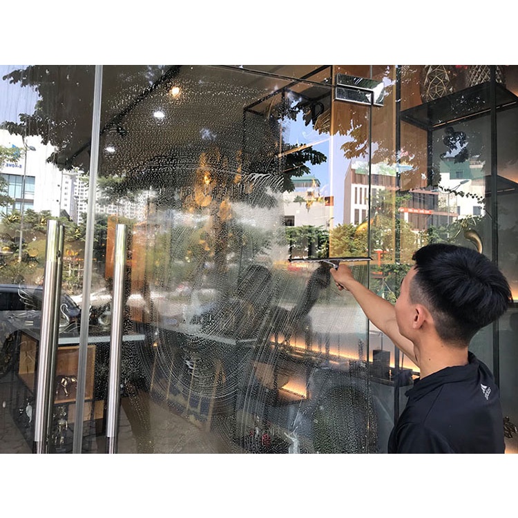 + Bước 2: Dùng tay gạt kính inox gạt sạch nước bẩn xuống. Gạt từ mép trên tấm kính xuống mép dưới tấm kính theo phương thẳng đứng. Sau mỗi lần gạt dùng khăn lau khô lưỡi gạt rồi gạt tiếp, tránh để lại vết trong lần gạt tiếp theo.