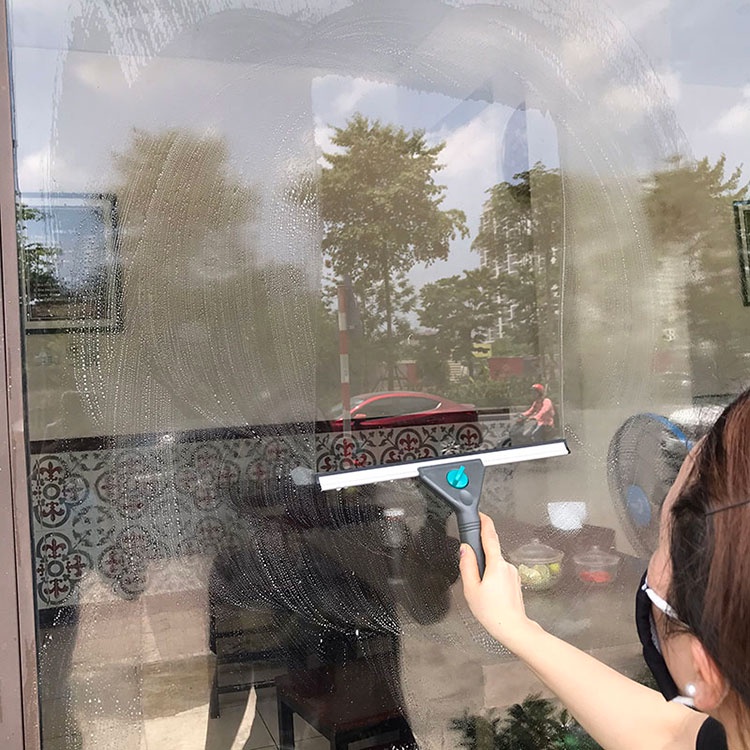 - Bước 1: Dùng bình xịt kính, xịt đều lên bề mặt cửa kính cần làm sạch.