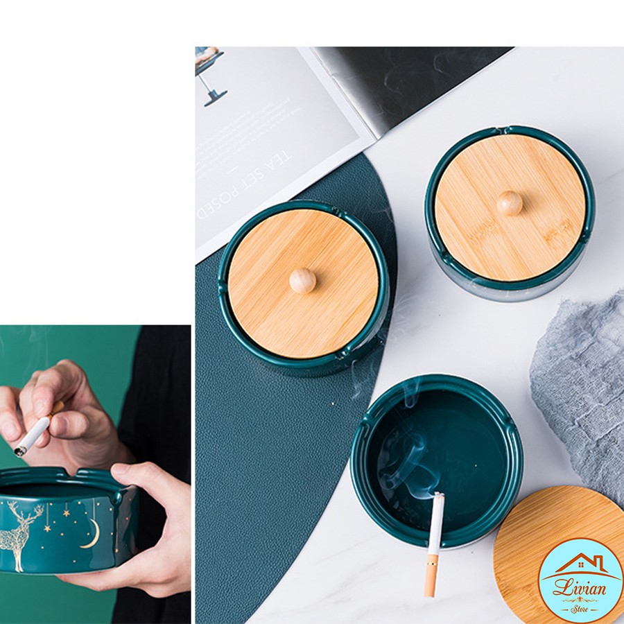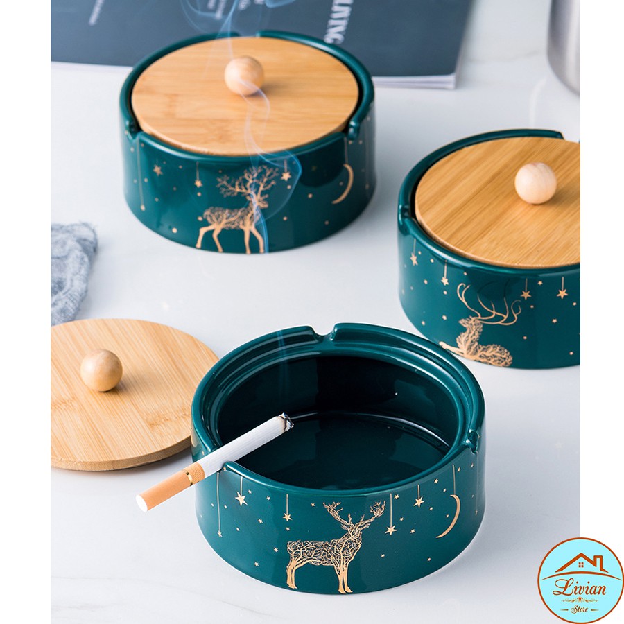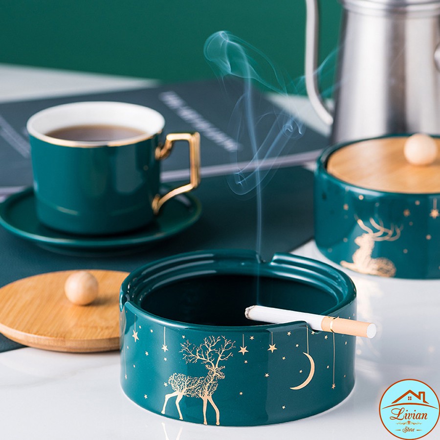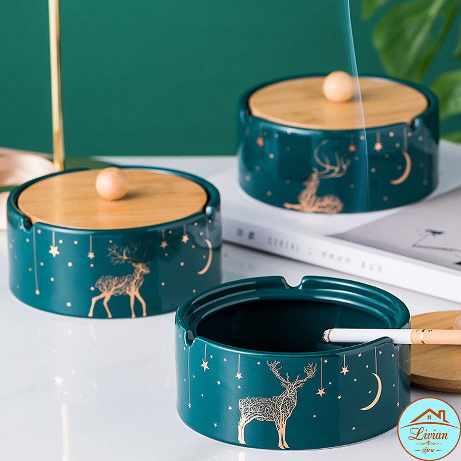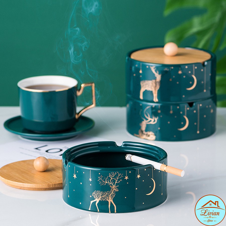 Nhà cửa & Đời sống > Trang trí nhà cửa > Khác || Gạt tàn thuốc lá bằng sứ có nắp - xanh cổ vịt - họa tiết hình hươu - HÀNG CÓ SẴNCòn hàng
